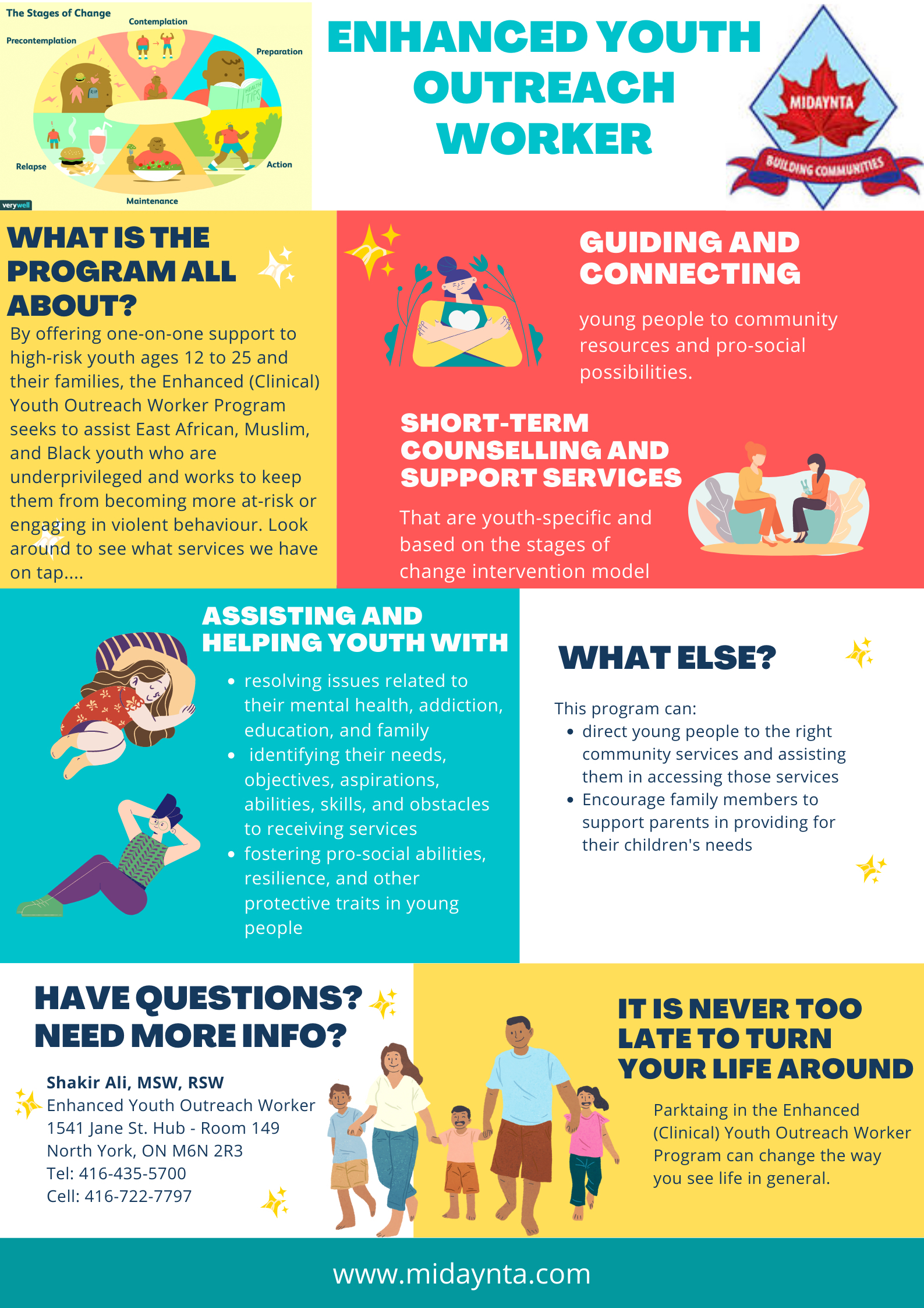 In order to ensure youth, 12-25 years old, meet their unique needs, our EYOW provides short-term counselling and support services based on the Stages of Change intervention model: